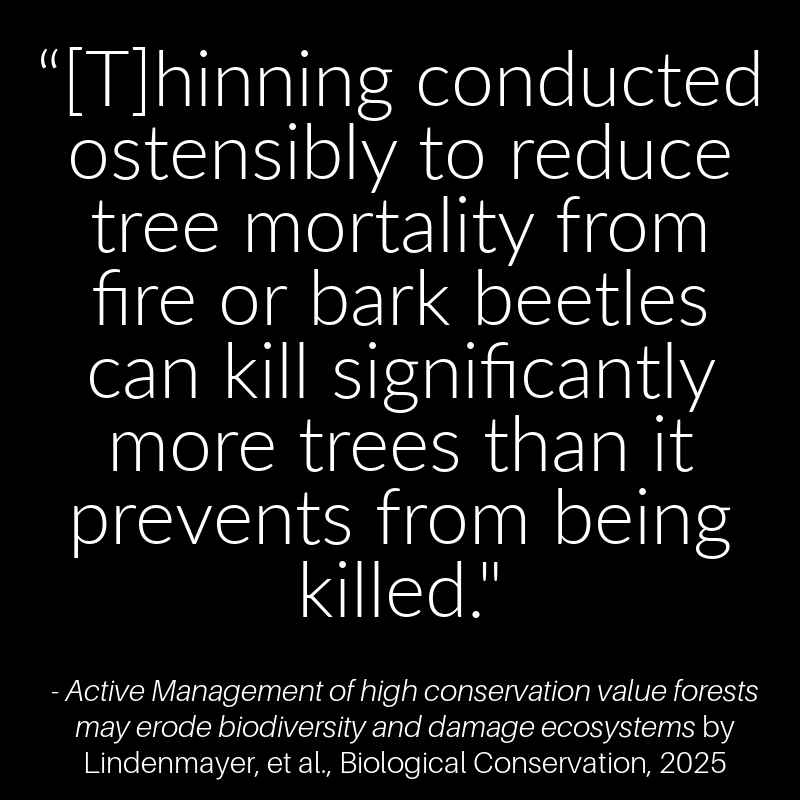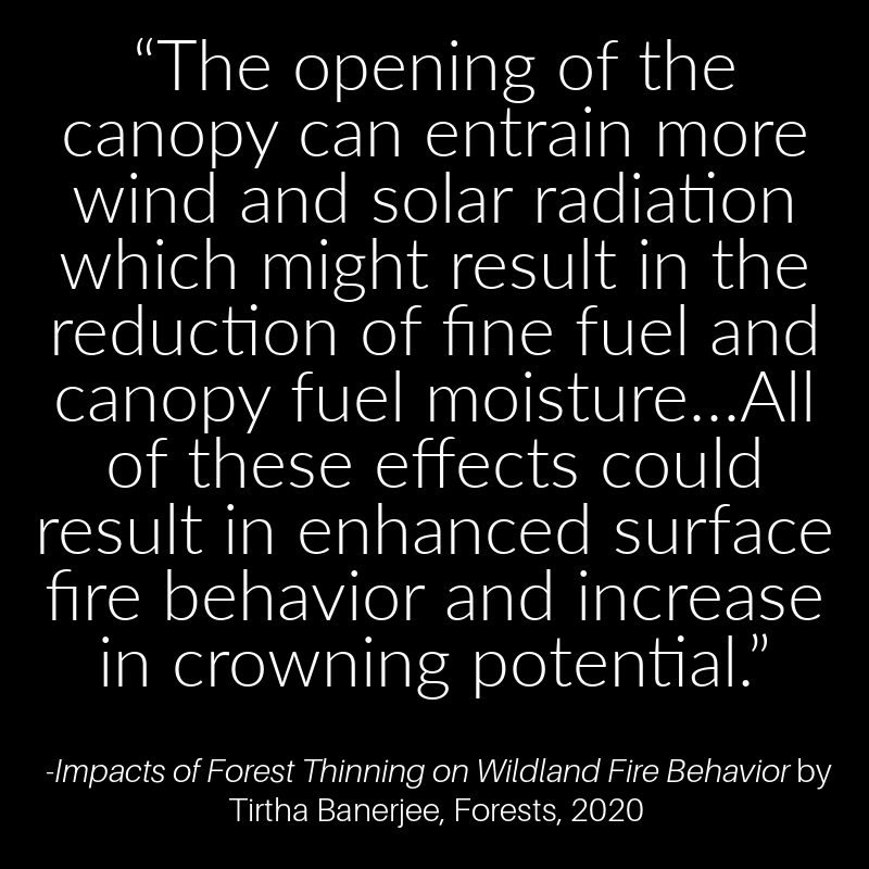 Other studies demonstrated how tree removal can make the forest microclimate hotter and dryer and therefore more likely to ignite and exacerbate a fire—including crown fires—and allow winds to spread flames to communities.