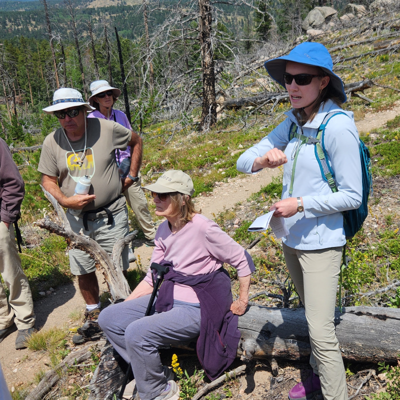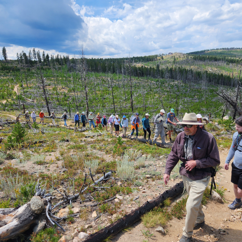 The hike began in a section of the Roosevelt National Forest where both small and large-diameter trees had been cut by the U.S. Forest Service in 2015 for a wildfire “fuel reduction” project. Guides pointed out blackened stumps charred during the 2016 Cold Springs fire.