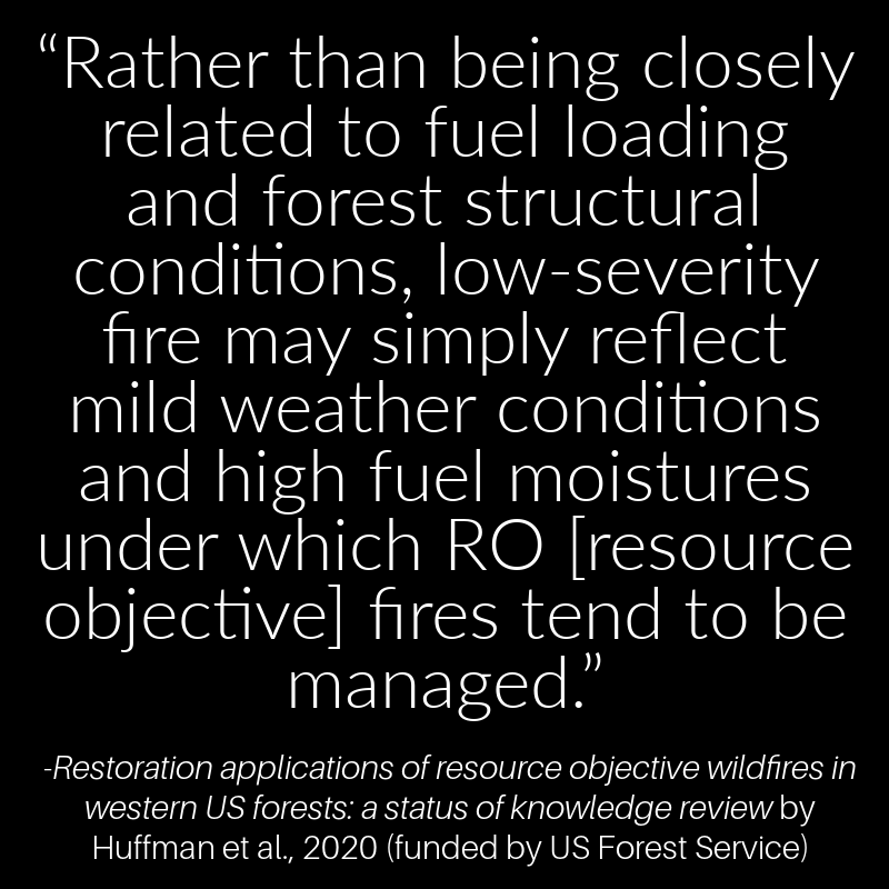 Guides also shared studies differentiating between an attempt to reduce fire severity in the forest—a questionable aim in that many ecosystems and wildlife are dependent on such fires and “thinning” often kills more trees than fire—and the goal of preventing flames from spreading to communities.